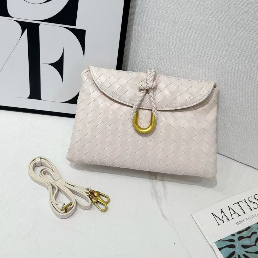 This woven crossbody bag features a stylish gold accent, adding a touch of elegance to any outfit. The sturdy construction and compact size make it perfect for everyday use, while the adjustable strap offers versatile wearing options. Elevate your style with this must-have accessory.